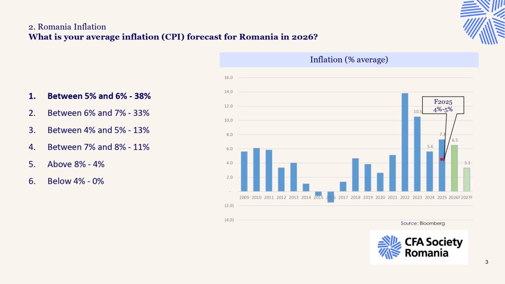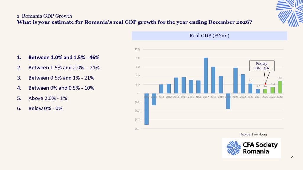 Economia României intră în 2026 cu o combinație rară de creștere anemică, inflație încă ridicată și risc politic în creștere – un cocktail mai degrabă de gestionat decât de celebrat. Pentru un investitor sau un antreprenor, mesajul unui sondaj CFA România este clar: 2026 e anul execuției lucide și al apetitului de risc bine calculat.
