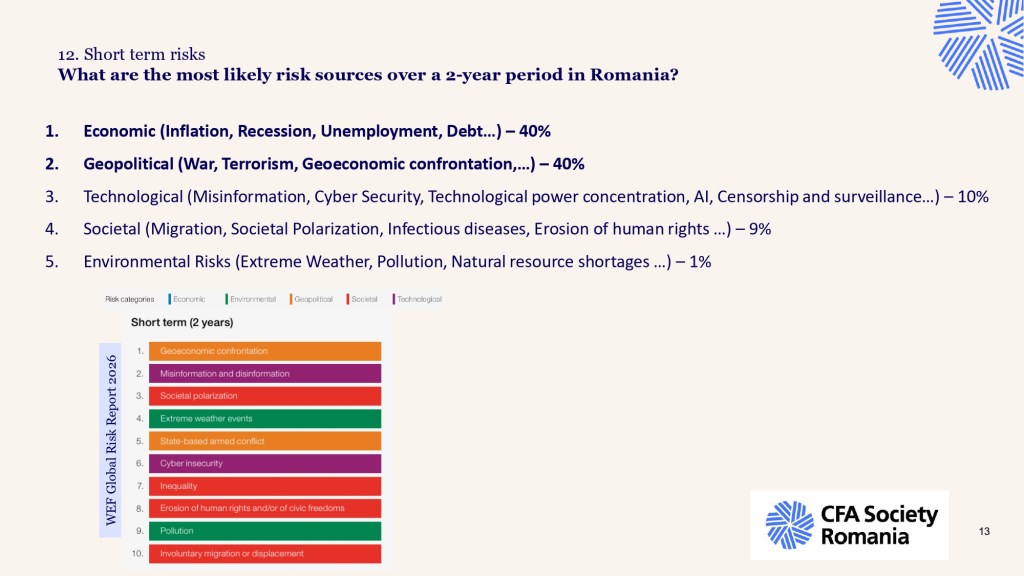 Pe orizont de doi ani, respondenții împart aproape egal riscurile între sfera economică (inflație, recesiune, șomaj, datorie) și cea geopolitică (război, terorism, confruntare geoeconomică), ceea ce plasează România într-o zonă de incertitudine multiplă. Pentru mediul de afaceri, consecința este o primă de risc mai ridicată cerută pentru proiectele pe termen lung și preferința pentru flexibilitate operațională în detrimentul investițiilor ireversibile