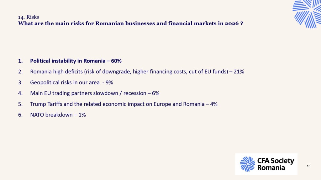 O creștere de 10–20% a BET-XT pentru 2026, așa cum anticipează o parte semnificativă a respondenților, ar însemna un an bun pentru investitorii de capital, într-un mediu macro doar mediocru. Lectura tip FT/WSJ a acestui contrast este intuitivă: piața recuperează o parte din discountul aplicat în anii de anxietate macro, mizând pe stabilitatea ratingului de investiții și pe absența unor șocuri interne majore.