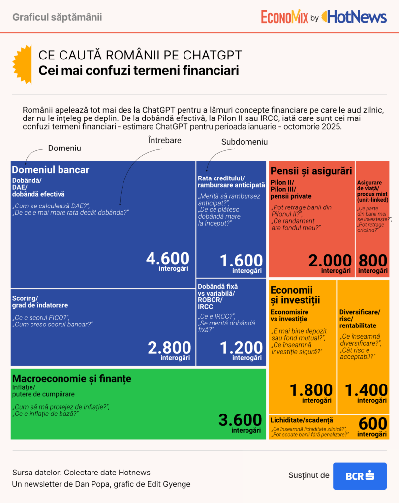 „Cum se calculează DAE?”, „De ce e mai mare rata decât dobânda?”, „Cum să mă protejez de inflație?”, „Ce e inflația de bază?”, „Ce e scorul FICO?”, „Cum îmi cresc scorul bancar?” Acestea par să fie cele mai frecvente întrebări pe care românii le pun ChatGPT, potrivit unei sesiuni de lucru cu celebrul motor de AI.