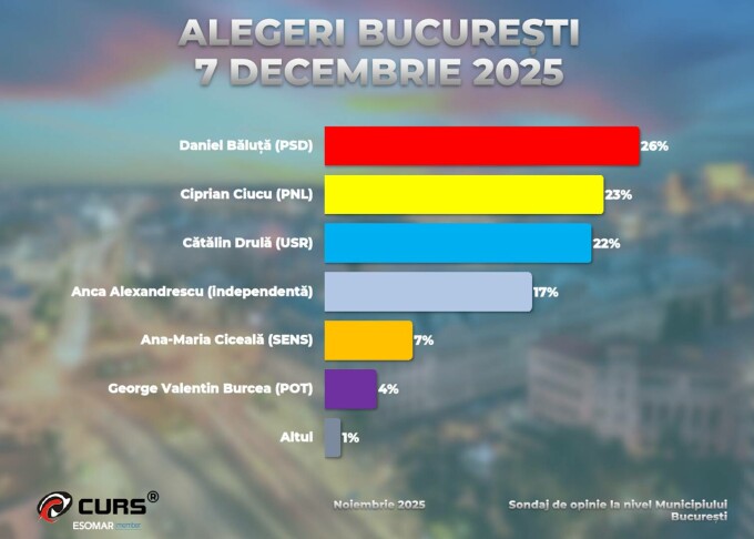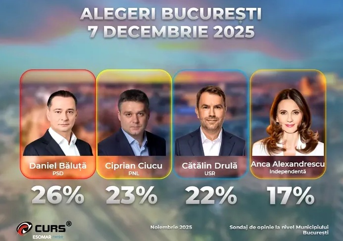 Conform sondajului CURS, candidatul PSD la Primăria București, Daniel Băluță, actualul edil al Sectorului 4, ar urma să obțină 26% din voturile alegătorilor.