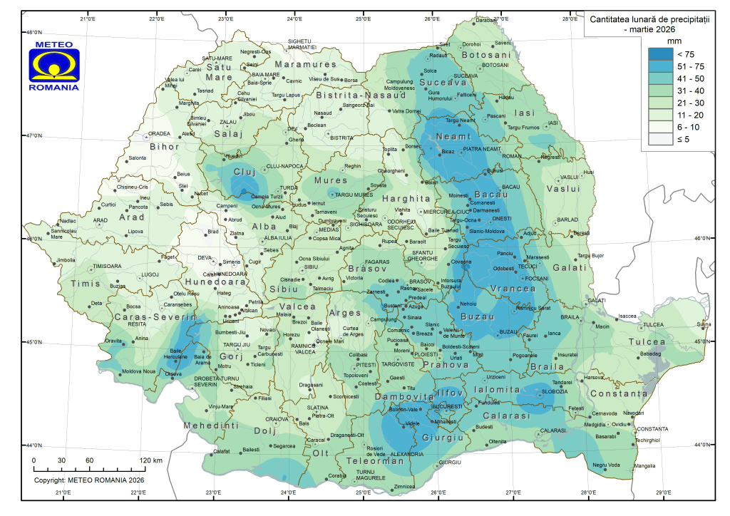 Cantitatea totală de precipitații medie pe țară din luna martie 2026 a avut valoarea de 31 mm (l/mp), fiind cu 23% mai mică față de mediana intervalului de referință standard (1991 – 2020). La București s-a trecut de 50 mm, cu 83% peste media multianuală, mai arată datele ANM.