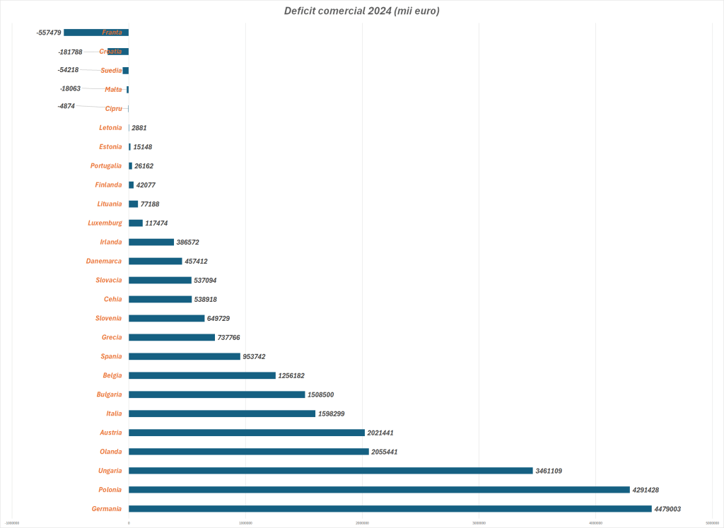 România are deficite comerciale cu 21 de țări din UE și menține excedente cu 5 dintre ele. Astfel, importăm la greu inflație, dar și exportăm. În final, datele publicate de Eurostat confirmă că rămânem țara cu cea mai mare inflație din UE.