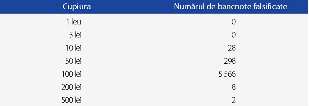 Numărul de falsuri la 1 milion de bancnote autentice în circulație a fost de 3,8 bucăți, față de 3,2 bucăți în anul 2017.