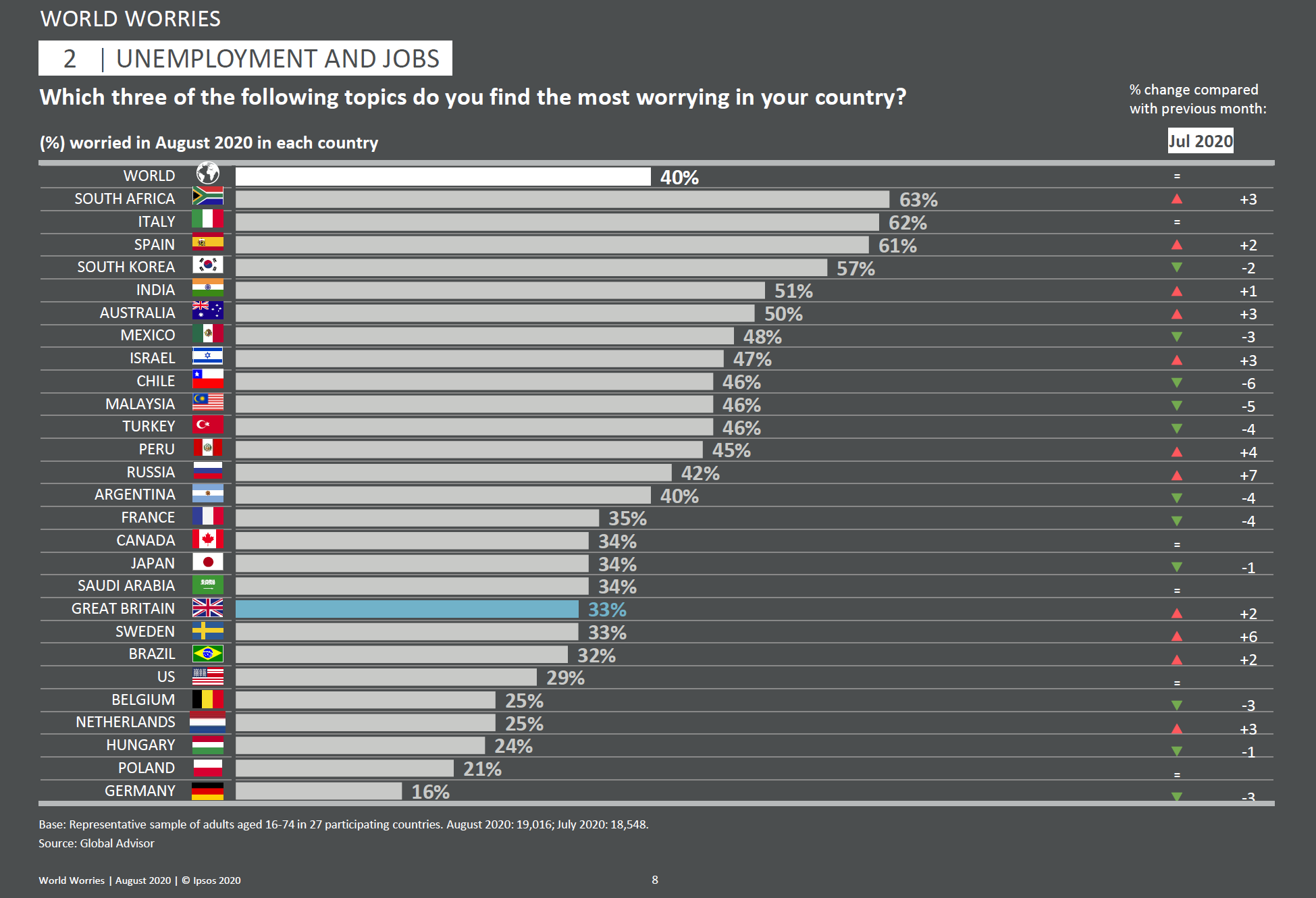 În privința îngrijorărilor legate de șomaj, Spania și Italia sunt țările europene cele mai marcate, în vreme ce pentru germani și maghiari șomajul nu pare să reprezinte o îngrijorare.