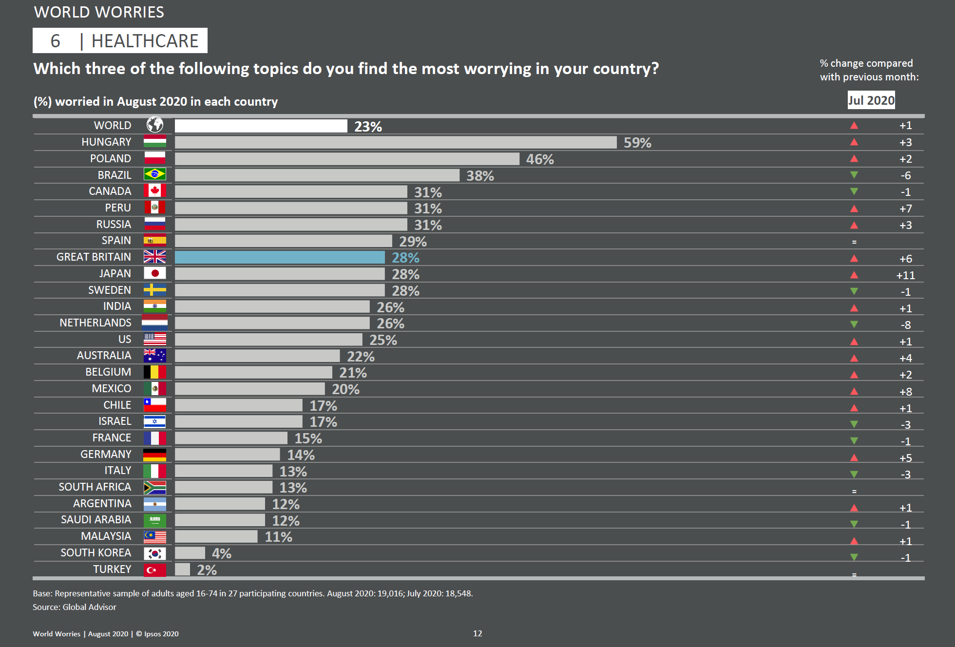 Circa jumătate din populația lumii consideră coronavirusul drept una din cele mai mari îngrijorări, conform concluziilor celui mai recent sondaj What Worries the World publicat de Ipsos. COVID-19 este menționat ca fiind principala grijă în 14 din cele 27 de țări chestionate și este cea mai mare preocupare pentru a cincea lună consecutivă. Pandemia este de departe prima îngrijorare în Japonia, Australia, Malaezia și Spania, cu peste jumătate din cetățeni foarte îngrijorați de acest subiect.