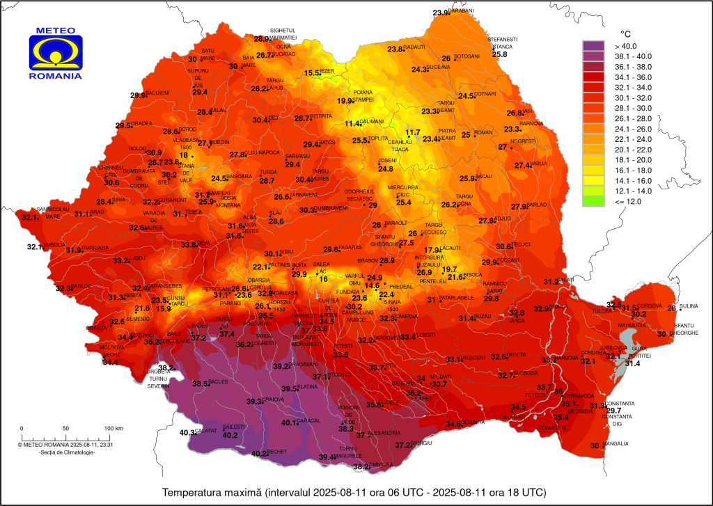 Luni au fost +40,3 °C la Calafat, +40,2 °C la Băilești și Bechet și +40,1 °C la Caracal. Cel mai rece a fost la prânz la stația meteo de mare altitudine din munții Călimani (+11,4 °C), arată harta ANM.