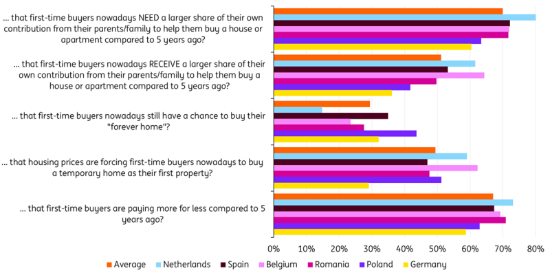 Olanda are cea mai mare pondere a respondenților care se așteaptă ca cei care cumpără o locuință pentru prima dată să aibă nevoie de mai mult sprijin din partea părinților sau a familiei decât în urmă cu cinci ani și, de asemenea, cea mai mare pondere a celor care consideră că raportul calitate-preț a scăzut pentru cei care cumpără o locuință pentru prima dată. De asemenea, Olanda are, de departe, cei mai puțini respondenți care cred că prima proprietate a cuiva poate fi în continuare „casa vieții”.