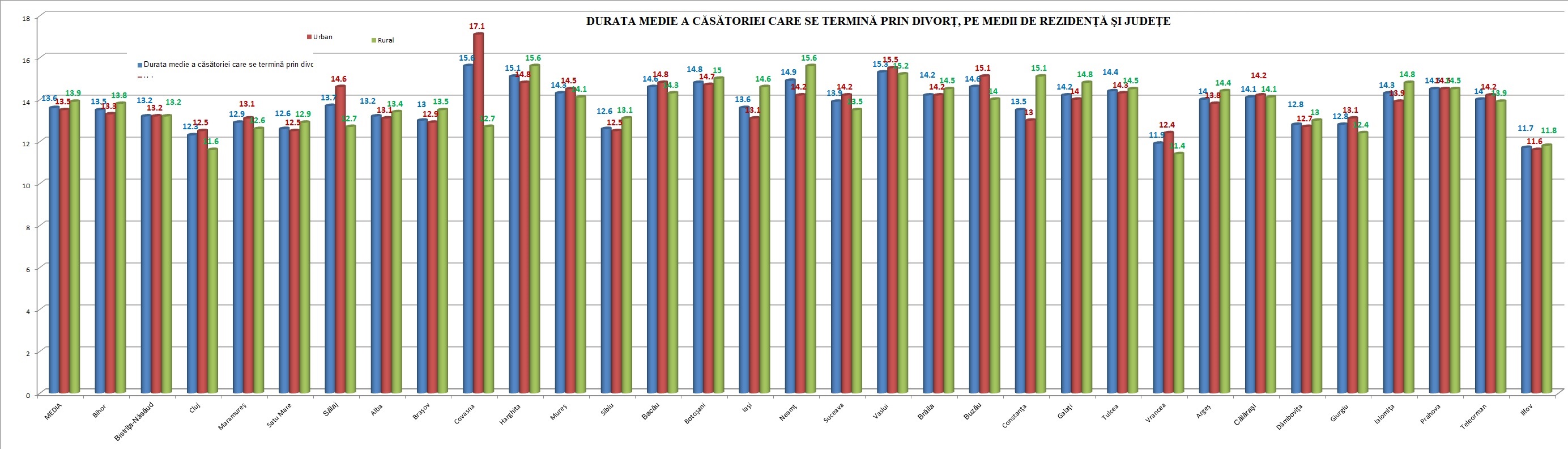 Pe judeţe, vârsta medie la divorţ a înregistrat cea mai ridicată valoare în judeţul Covasna atât pentru bărbaţi (42,3 ani), cât şi pentru femei (38,7 ani); cea mai mică valoare s-a înregistrat în judeţul Satu Mare pentru bărbaţi (38,8 ani), iar pentru femei în judeţul Vrancea (35,1 ani).