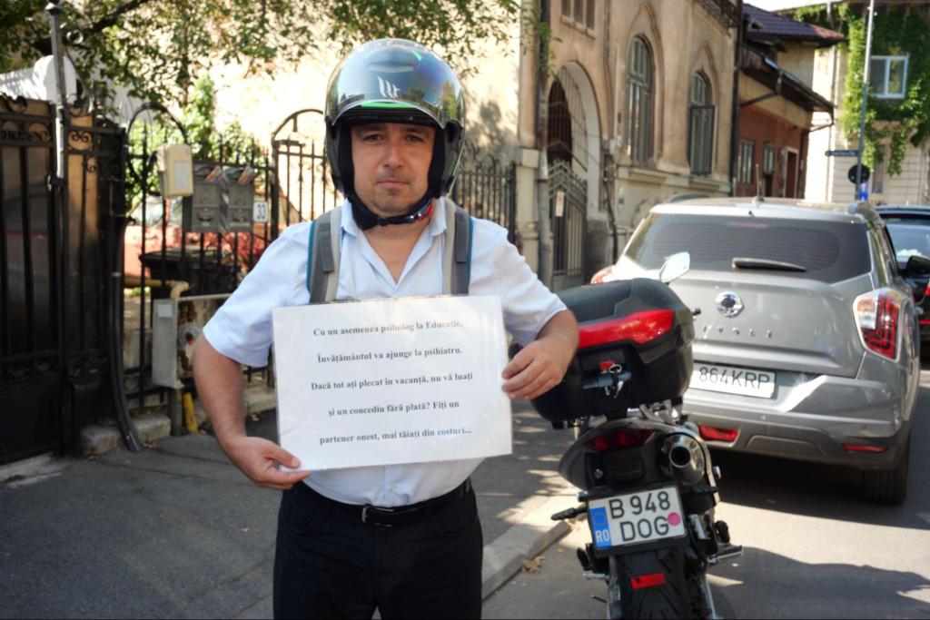 Pe motor și cu mesaje de protest, Ignat Ionel, profesor de limba și literatura română la Liceul Teoretic „Decebal” din sectorul 3 al Capitalei, s-a alăturat colegilor săi în stradă. Predă de 23 de ani. Schimbările din noul an îi lovesc direct pe profesori, spune el.
