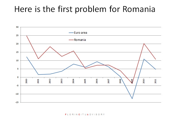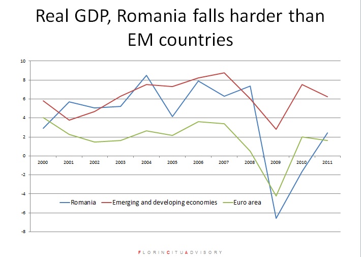 In graficul de mai sus aveti contractia economica a Romaniei, comparativ cu cea a altor state. Economia noastra s-a contractat de o maniera mult mai ampla comparativ cu celelalte economii, concluzia lui Citu fiind ca in perioade de criza economica se vad carentele unei economii. Cata vreme lucrurile merg bine, totul pare ok. Cand vine o criza si economia se contracta mult peste media celorlalte state, e un semnal ca in acea economie ai avut probleme. O criza iti poate arata unde ai avut vulnerabilitatile economice”, a mai aratat analistul roman.