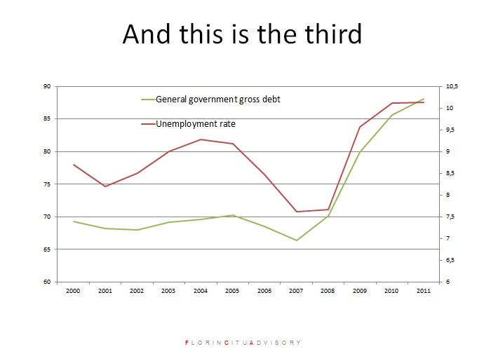 O a treia problema o reprezinta legatura dintre datoria publica si somaj. „Cei doi indicatori par infratiti. Oamenii vor asocia cele doua evolutii similare si vor ramane cu sentimentul ca atunci cand datoria creste, o perioada de somaj ridicat poate fi iminenta”, a spus Citu.