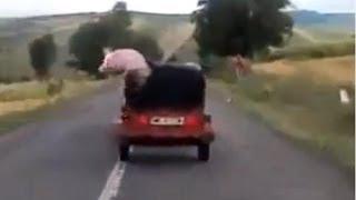 Clipul zilei: Se intampla in Romania: un porc sare din masina