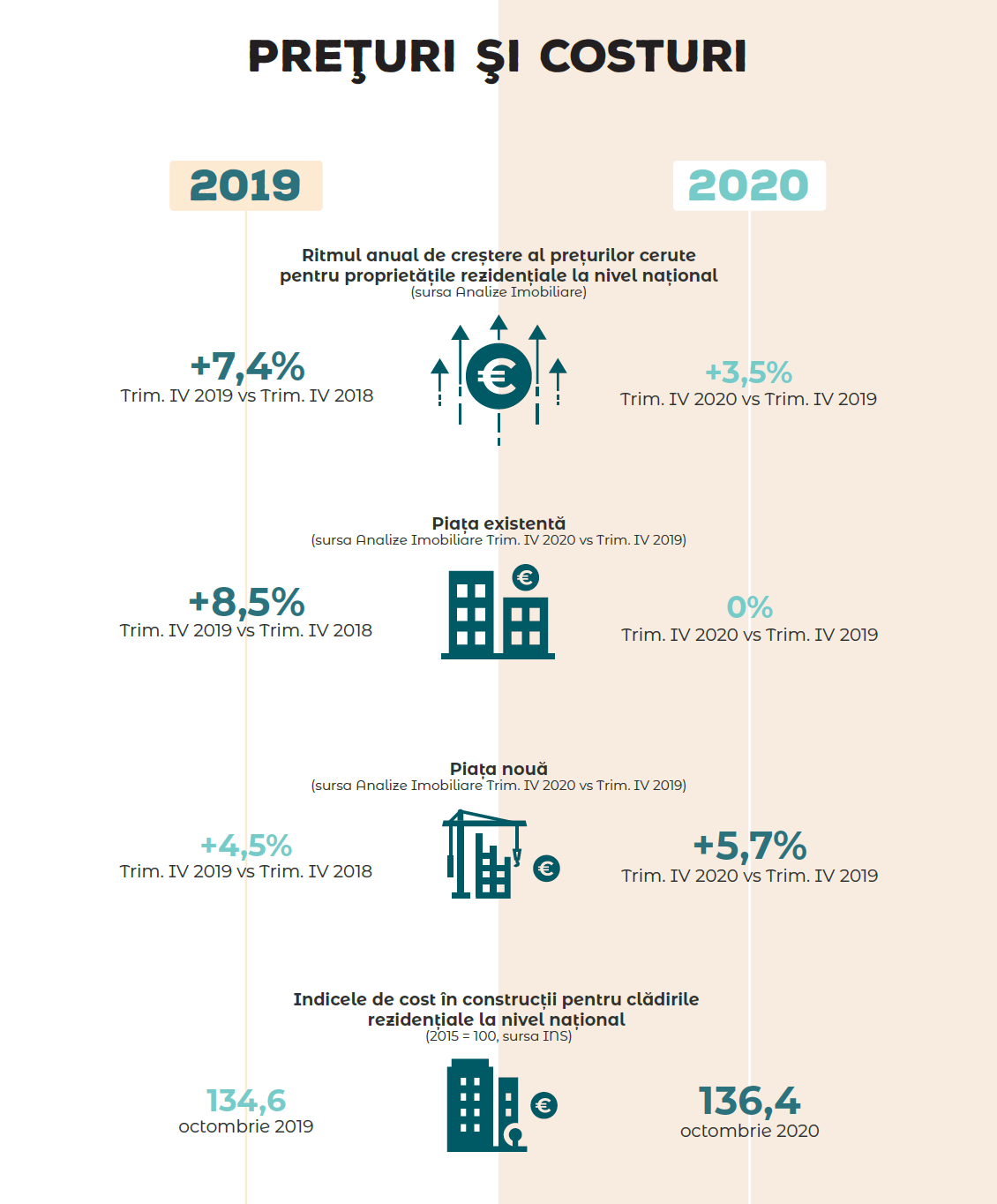 Prețurile solicitate au crescut cu 3,5% în 2020, un ritm mai scăzut decât în 2019. Deși în primul trimestru din 2020 ritmul anual de creștere al prețurilor solicitate pentru proprietățile rezidențiale s-a majorat la aproape 9,5%, efectele pandemiei s-au resimțit, totuși, în următoarele două trimestre. Abia în ultimele trei luni am înregistrat din nou o creștere de 1,9% a prețului cerut pentru proprietățile rezidențiale, în comparație cu trimestrul anterior, astfel încât diferența față de anul trecut a ajuns la +3,5%. Prețurile au crescut pe segmentul nou (unități vândute direct de către dezvoltatori), cu un ritm anual de 5,7%, în timp ce pe segmentul existent (proprietăți revândute), prețurile cerute au stagnat.