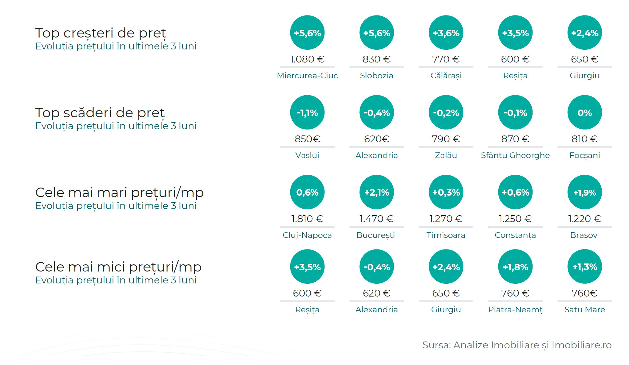 Cu un avans de 5,6%, pâna la 830 de euro pe metru patrat util, Slobozia se situeaza la egalitate cu Harghita, în vreme ce Calarașiul ocupa poziția secunda în topul scumpirilor (+3,6%, pâna la 770 de euro pe metru patrat), urmat fiind de Reșița (+3,5%) și, respectiv, Giurgiu (+2,4%). Dintre reședinele de județ analizate, au existat și câteva în care au avut loc scaderi de preț trimestrul trecut – cu mențiunea ca aceste variații negative s-au situat, cu o singura excepție, sub pragul de 1%. Pe primul loc în clasamentul ieftinirilor se afla, astfel, Vasluiul, cu un minus de 1,1% (pâna la 850 de euro pe metru patrat util), orașul din Moldova fiind urmat de Alexandria (-0,4%), Zalau (-0,2%, pâna la 790 de euro pe metru patrat) i, respectiv, Sfântu Gheorghe (-0,1%, pâna la 870 de euro pe metru patrat).