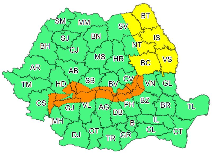 Codul portocaliu avertizează că, la munte, la altitudini de peste 1500 m, vântul va avea intensificări susținute, cu rafale de peste 120…140 km/h, va fi viscol puternic și vizibilitate foarte scăzută.