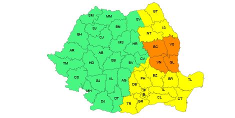 În judeţele Vrancea, Galaţi, Vaslui şi Bacău vor fi averse torenţiale, frecvente descărcări electrice, intensificări ale vântului, vijelii (rafale de 50…70 km/h) şi pe alocuri grindină. În intervale scurte de timp (1-3 ore) sau prin acumulare cantităţile de apă vor fi de 30…40 l/mp şi izolat de peste 50 l/mp, a mai transmis ANM.