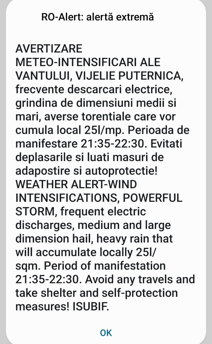 A fost emis și un mesaj Ro-Alert, bucureștenii fiind atenționați că în Capitală e cod portocaliu de vijelie puternică: „Evitați deplasările și luați măsuri de adăpostire și autoprotecție”.