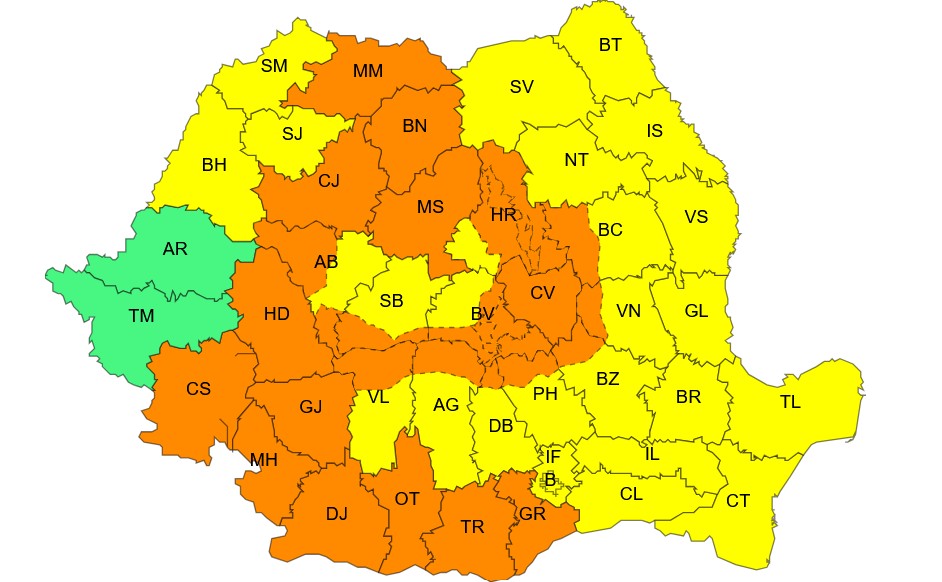 Totodată, de la ora 14.00, intră în vigoare un alt cod portocaliu, care vizează județele Caraș-Severin, Hunedoara, Cluj, Mureș, Bistrița-Năsăud, Maramureș, Covasna, precum și la munte.