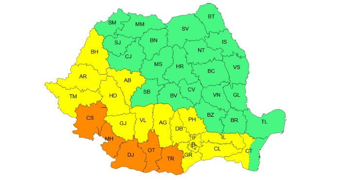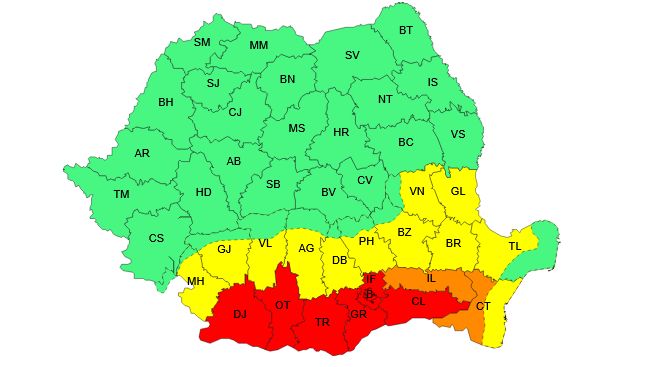 Un cod galben de caniculă, valabil în intervalul 21 iulie, ora 10 – 22 iulie, ora 10, ce vizează nordul Banatului, Crișana, sud-vestul Transilvaniei, nordul Olteniei, cea mai mare parte a Munteniei și sud-vestul Dobrogei.