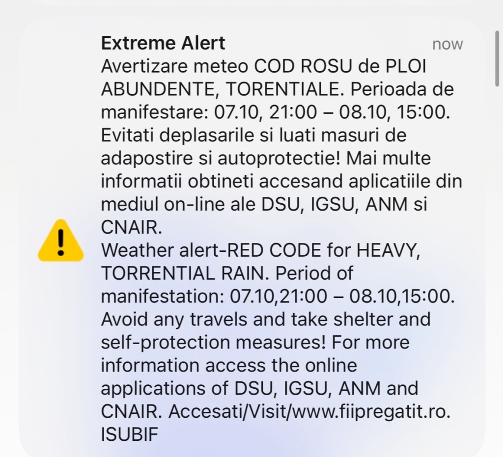 „Avertizare Cod Roșu de ploi abundente, torențiale. Perioada de manifestare 7 octombrie, ora 21.00 – 8 octombrie, ora 15.00. Evitați deplasările și luați măsuri de adăpostire și autoprotecție!”, scrie în mesajul transmis.