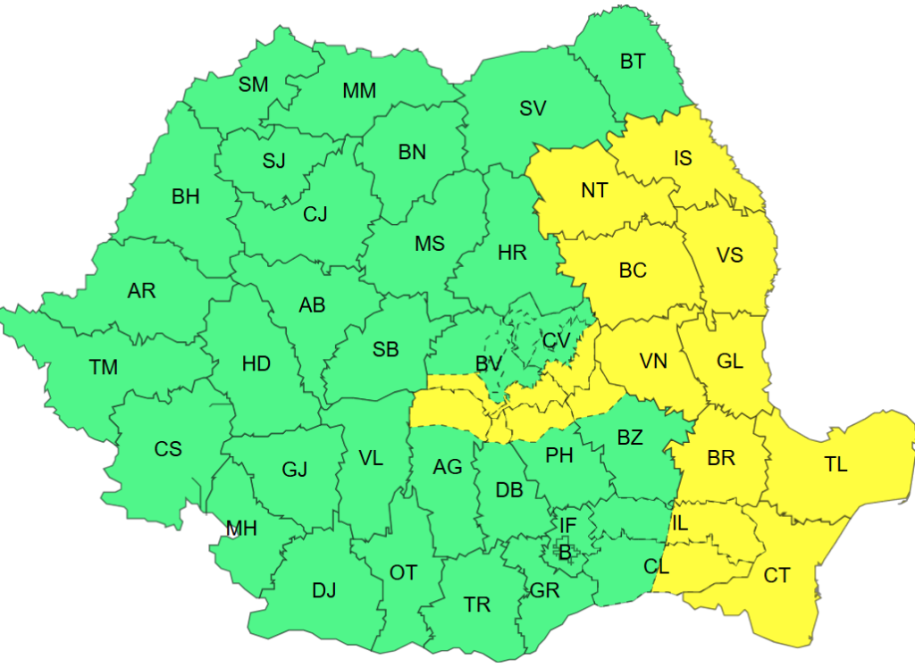 ANM a emis și un cod galben de vânt, valabil de miercuri, ora 23, până joi, ora 18:00.