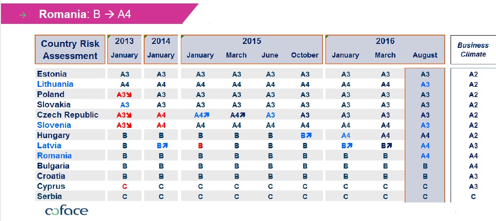 Coface a anuntat imbunatatirea riscului de tare de la B la A4, a anuntat miercuri Eugen Anicescu, country manager Coface Romania. Practic, desi se numeste risc de tara, ratingul Coface se refera la riscul de neplata din mediul economic. Potrivit metodologiei Coface, ratingul A4 arata un istoric al platilor mediocru, ce se poate inrautati din cauza unui mediu economic si politic, ce se deterioreaza. Cu toate acestea, probabilitatea de neplata este acceptabila. „Vedem este o fiesta a consumului. Vedem cresteri de salarii, scaderi de TVA, acestea aducand lichiditate in piata, dar trebuie sa ne uitam si la fundamente, care nu arata ca ar fi la fel de sustenabile si in perioada viitoare. Spatiul fiscal se cam termina si ar trebui sa fim mai prudenti” a mai spus Anicescu.