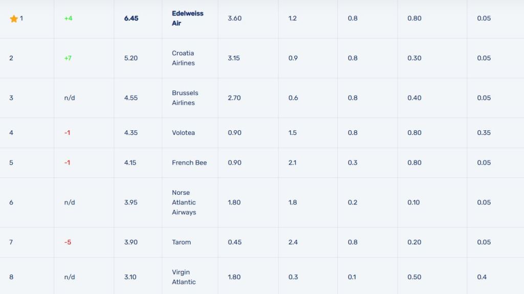 Indicele evaluează companiile aeriene majore pe o scară de 1 la 7, 7 fiind scorul maxim: