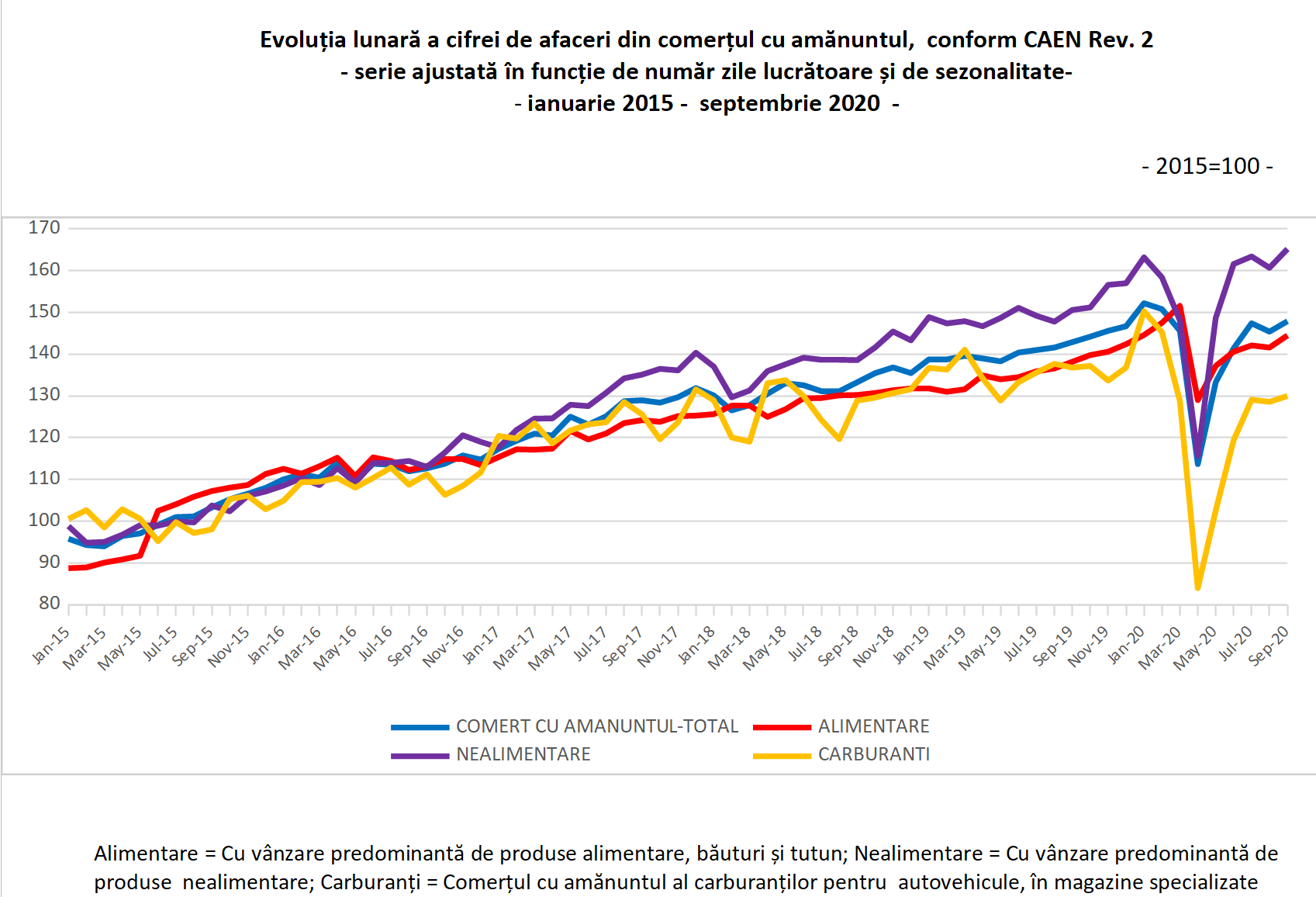 Consumul privat (principala componentă a PIB), bine aproximat de volumul cifrei de afaceri din comerţul cu amănuntul, a crescut în primele 9 luni cu 1,7% datorită creşterii vânzărilor de produse alimentare, băuturi şi tutun (+5,8%) şi vânzărilor de produse nealimentare (+3,9%). Comerţul cu carburanţi pentru autovehicule în magazine specializate a scăzut cu 8,4%, transmite joi Institutul Național de Statistică.
