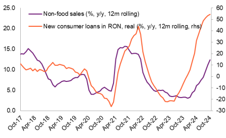 Vânzările de alimente au crescut în octombrie 2024 față de octombrie 2023 cu 5,2% an/an, vânzările de produse nealimentare a crescut cu 18,9% a/a, în timp ce vânzările de carburanți au încetinit în termeni anuali la +2,2%