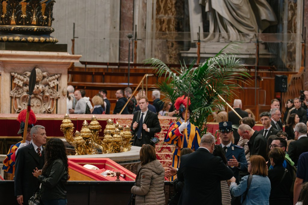 După ce trec pe lângă sicriul papei Francisc, se odihnesc printre coloanele impunătoare, se roagă, râd şi se bucură că sunt împreună. Unii au baticuri de identificare, alţii sunt organizaţi de ghid cu steguleţ, mulţi poartă guler roman de culoare albă.