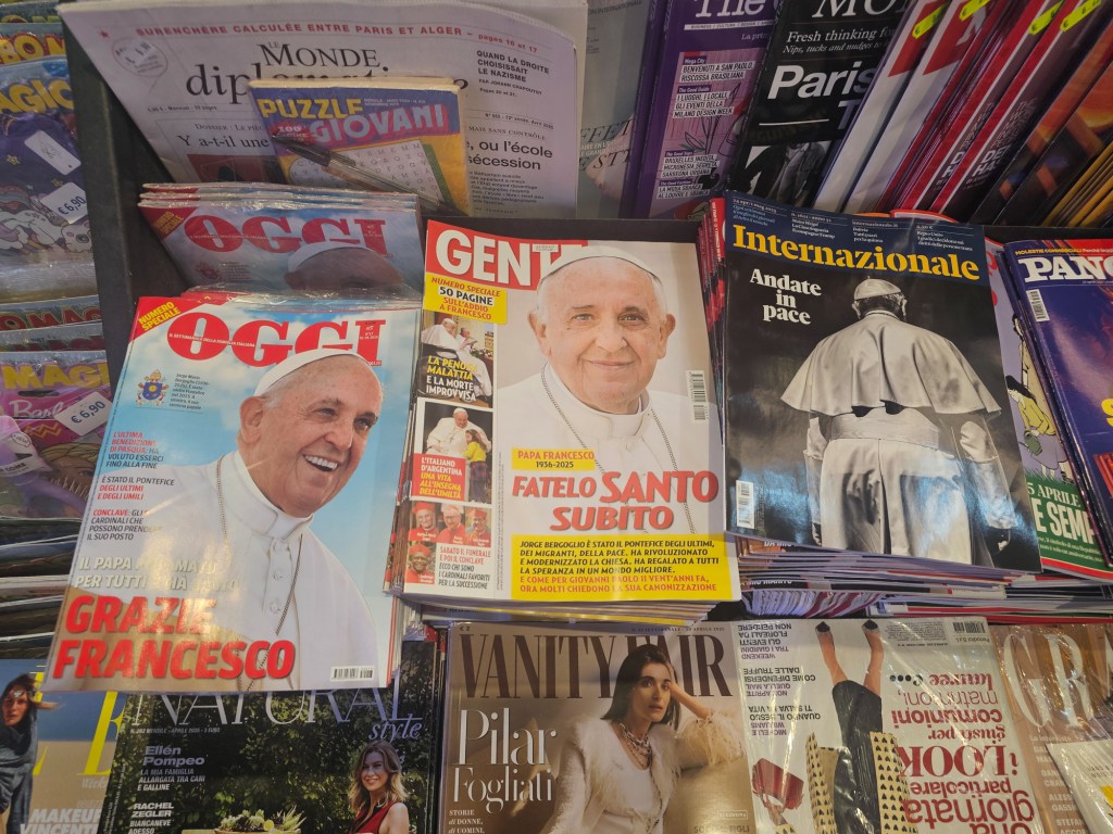 „Mulţumim, Francisc”, „Frate sfânt imediat”, „Mergi în pace”. Sunt titlurile de pe prima pagina ale revistelor italiene. „Italianul din Argentina. O viaţă sub steagul umilinţei” este unul dintre titlurile articolelor.
