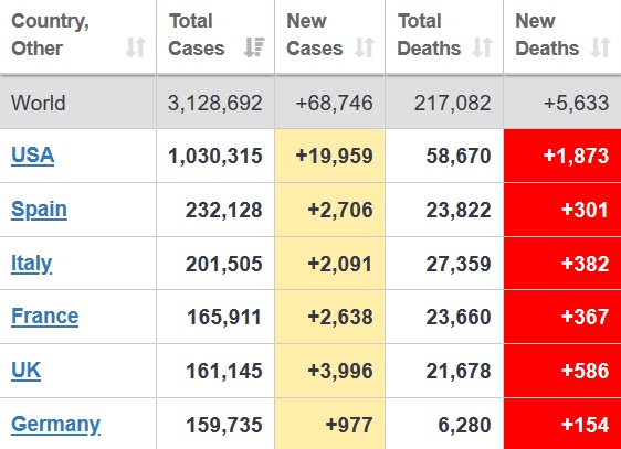 Numărul de infecții cu coronavirus din lume a ajuns la 3.128.000, iar cel al deceselor la 217.000, peste 950.000 de pacienți fiind declarați vindecați, potrivit centralizării datelor despre pandemie realizate de site-ul Worlodmeters.
