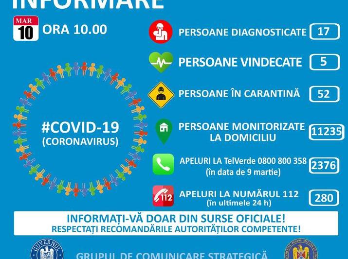 Până marți, la nivel național au fost confirmate 17 cazuri de cetățeni infectați cu COVID – 19 pe teritoriul României.