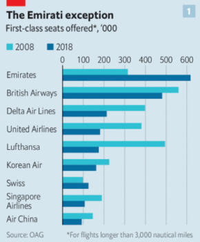 Pe rutele lungi, noile scaune care se transformă în paturi au schimbat jocul. Ele au fost lansate de British Airways la First în 1995 și au devenit foarte dorite. Dacă pasagerii pot dormi confortabil în înaltul cerului pot evita costul hotelului sau, și mai important pentru corporatiștii presați de timp, pot câștiga o zi de lucru. În anul 2000 British a lansat scaunul similar la Business și toți transportatorii au preluat modelul. Aceasta a redus cererea pentru First Class. Cele mai multe firme cred că un pat orizontal la Business este suficient de bun pentru angajați. Numai câțiva potentați mai au dreptul să se bucure de First Class pe banii firmei. Companiile care o mai oferă o fac din două motive. Primul este folosirea promovării de la Business ca premiu de loialitate pentru clienți corporatiști sau privați. Dar cum diferența dintre Business și First este în scădere, călătorii frecvenți încep să răspundă mai bine la alte stimulente, ca accesul la saloane sau la oferte speciale. Al doilea este și el în scădere. Este așa-numitul „efect de aură”, creat de companiile aeriene care fac reclamă condițiilor de la First Class. De exemplu, Etihad, alt rival pentru Emirates în Golf, a avut probabil mai multe citări în presă pentru apartamentele de First Class numite „The Residence” decât pentru toate celelalte 30.00 de scaune la un loc.