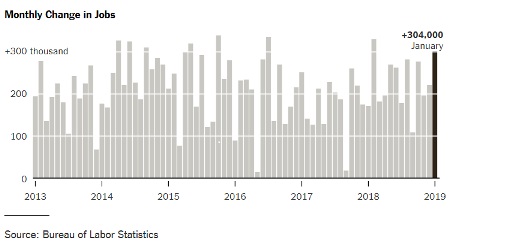 Adăugați recenta închidere a activității guvernamentale pe lista lucrurilor care n-au încetinit piața americană a locurilor de muncă. În ultimii opt ani, economia americană a îndurat tensiuni comerciale, impasuri ale creditării, crize ale politicii externe și tot felul de dezastre naturale. Tot acest timp, companiile au continuat să angajeze. Elasticitatea a continuat și în ianuarie, când angajatorii au fost indiferenți și la închiderea pe timp de o lună a activității guvernamentale, și la temerile privind o încetinire a economiei și au adăugat 304.000 de noi locuri de muncă, mult peste anticipări. Raportul Departamentului Muncii a marcat a 100-a lună de creșteri consecutivă, mai mult decât dublu față de precedentul record.
