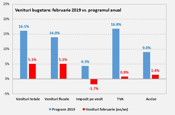 De exemplu, veniturile bugetare în februarie 2019 au crescut cu doar 5% față de februarie 2018, mult sub ținta anuală din bugetul 2019 de creștere a veniturilor cu 16%. De asemenea, veniturile din TVA au crescut cu doar 0,8% față de februarie 2018, deși ținta veniturilor din TVA necesită un plus de colectare de aproape 17% față de anul 2018.