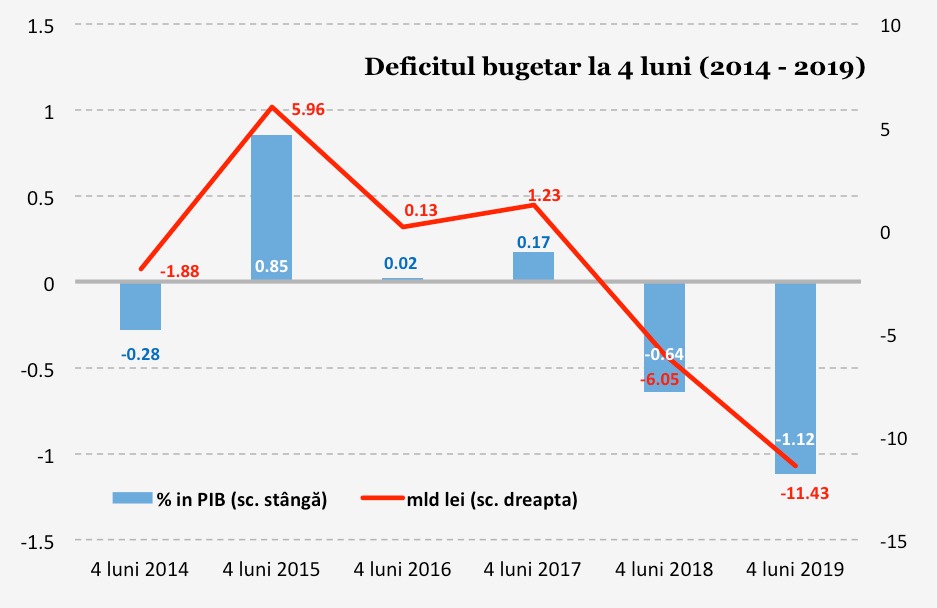 În anul 2019, execuția bugetară pe primele 4 luni arată că deficitul bugetar aproape s-a dublat față de nivelul aferent perioadei similare din 2018, de la 6 miliarde lei la circa 11,4 miliarde lei.