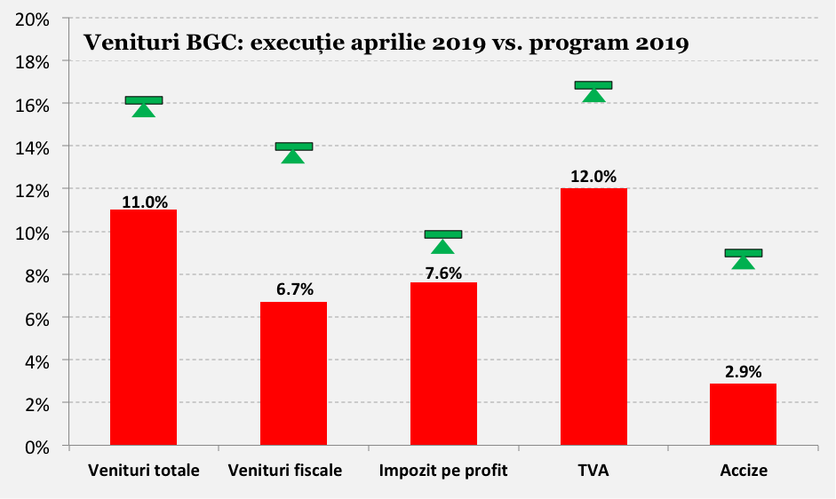 Execuția bugetară la sfârșitul lunii aprilie 2019 arată că veniturile bugetare sunt mult în urma țintei de creștere programată. De exemplu, pe primele 4 luni din 2019, veniturile fiscale au crescut cu doar 6,7% față de anul trecut, deși bugetul prevede o țintă de creștere a veniturilor fiscale de peste 16%.