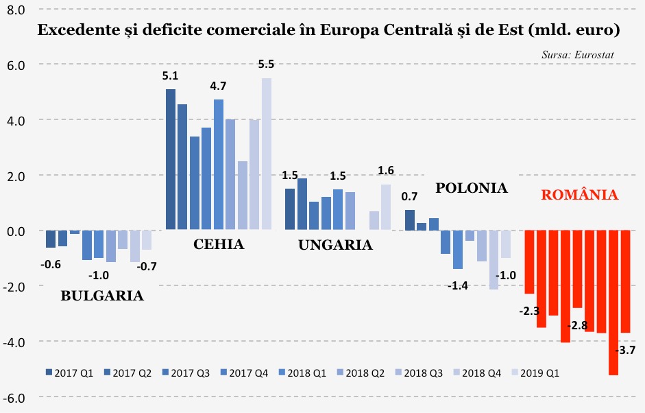 Potrivit graficului de mai sus, România este singura țară din Europa Centrală și de Est ale cărei deficite comerciale se adâncesc, ori aceasta înseamnă că pierdem în continuare oportunități importante pentru producția națională.