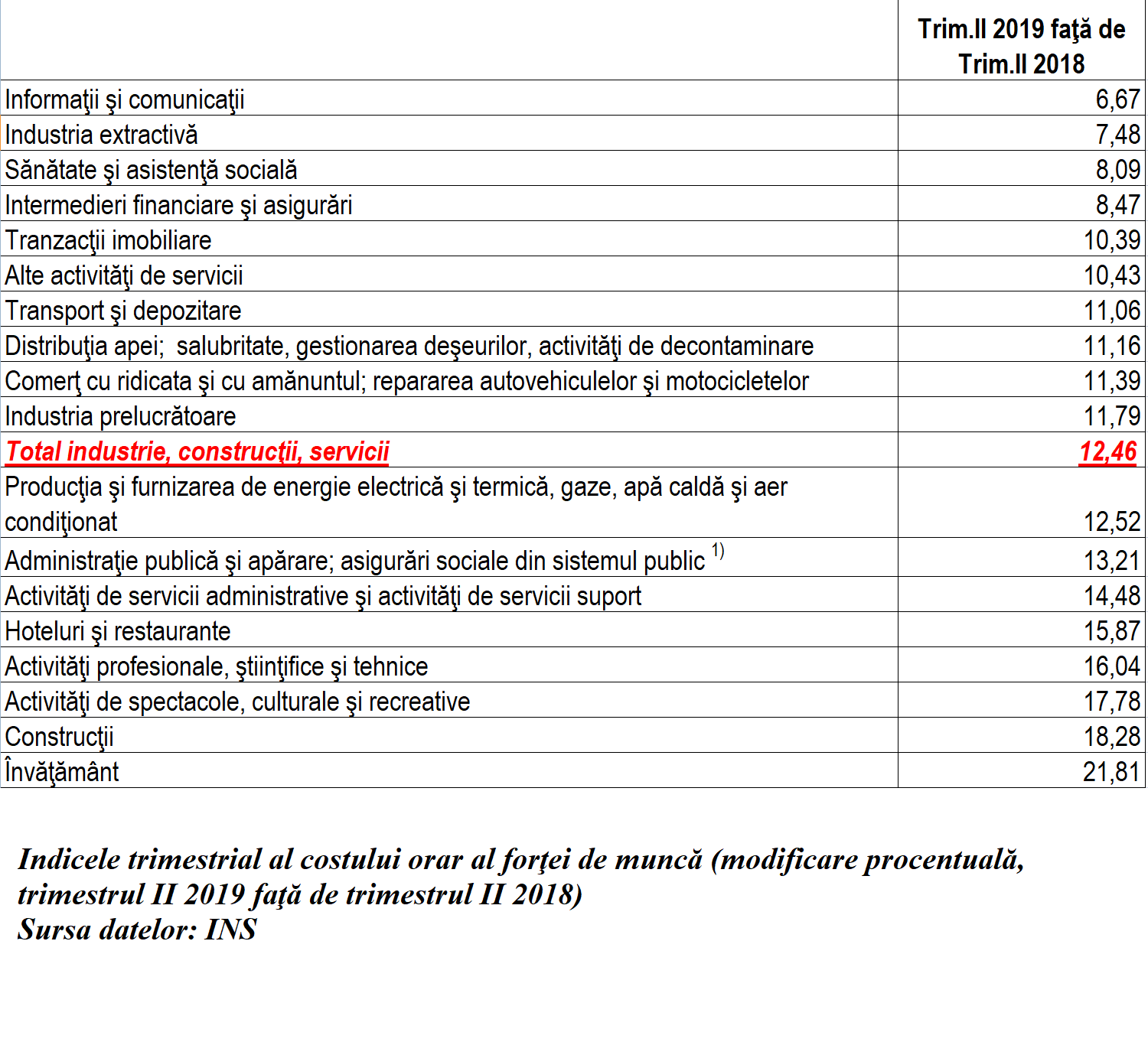 Comparativ cu acelaşi trimestru al anului precedent, costul orar al forţei de muncă a crescut cel mai mult în învăţământ (21,81%), respectiv în construcţii (18,28%) şi în activităţi de spectacole, culturale şi recreative (17,78%).