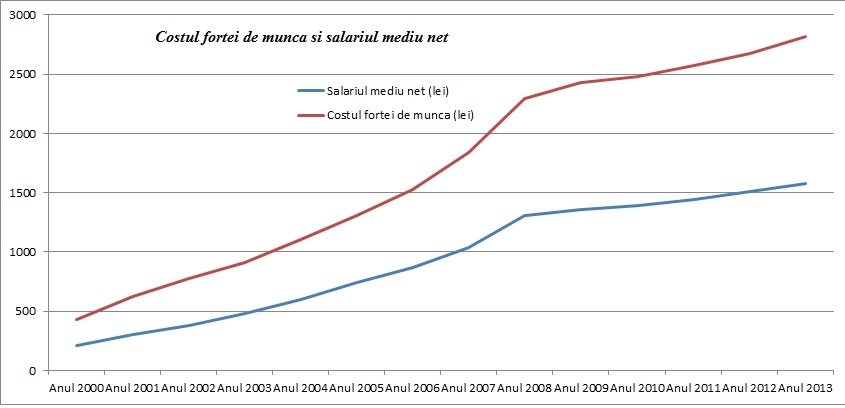 Inchipuiti-va doua firme: una in America si una la noi. In SUA, sa presupunem ca patronul are costuri lunare /angajat de 1000 de dolari, iar in Romania de numai 500 de dolari. Dar angajatul american produce 100 baloane, iar cel roman doar 40. In SUA, il costa 10 dolari balonul, pe cand in Romania 12,5 dolari. De ce ar veni in Romania, chiar daca avem costul cu forta de munca mai mic? Statistica a difuzat vineri datele cu privire la costul fortei de munca de la noi. Aflam astfel ca (virgula) cheltuielile lunare ale angajatorilor cu salariatii de la noi au fost anul trecut in medie de 2813 lei/salariat, mai mare cu 5,2% fata de 2012. Cresterea costului cu forta de munca nu inseamna ca salariatii au fost mai bine platiti, costul cu forta de munca crescand mai repede decat cresterea salariului net mediu (vezi mai jos graficul). Cresterea poate veni si din cresterea numarului de angajati (care au urcat astfel volumul cheltuielilor angajatorului), fie din cresterea fiscalitatii, fie dintr-o combinatie a celor doua elemente. Dupa reducerea cu 5 pp a CAS, costul cu forta de munca va cunoaste o reducere in dinamica, dar acest lucru se va vedea doar in viitoarele statistici. Mai important decat costul lunar al angajatorului cu salariatii mi se pare costul lunar al fortei de munca pe unitatea de produs.