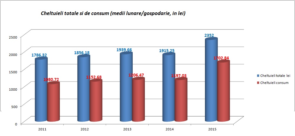 Asta in vreme ce cheltuielile totale ale populatiei, au fost, in anul 2015, in medie, de 2352 lei lunar pe gospodarie (885 lei pe persoana) si au reprezentat 87,5% din nivelul veniturilor totale, in scadere cu 3,2 puncte procentuale fata de anul 2014.
