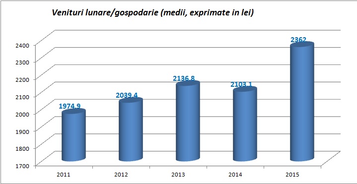 Veniturile totale lunare au reprezentat in anul 2015, in termeni nominali, 2687 lei pe gospodarie si 1011 lei pe persoana, in crestere cu 7,4%, respectiv, cu 7,8% fata de anul 2014.