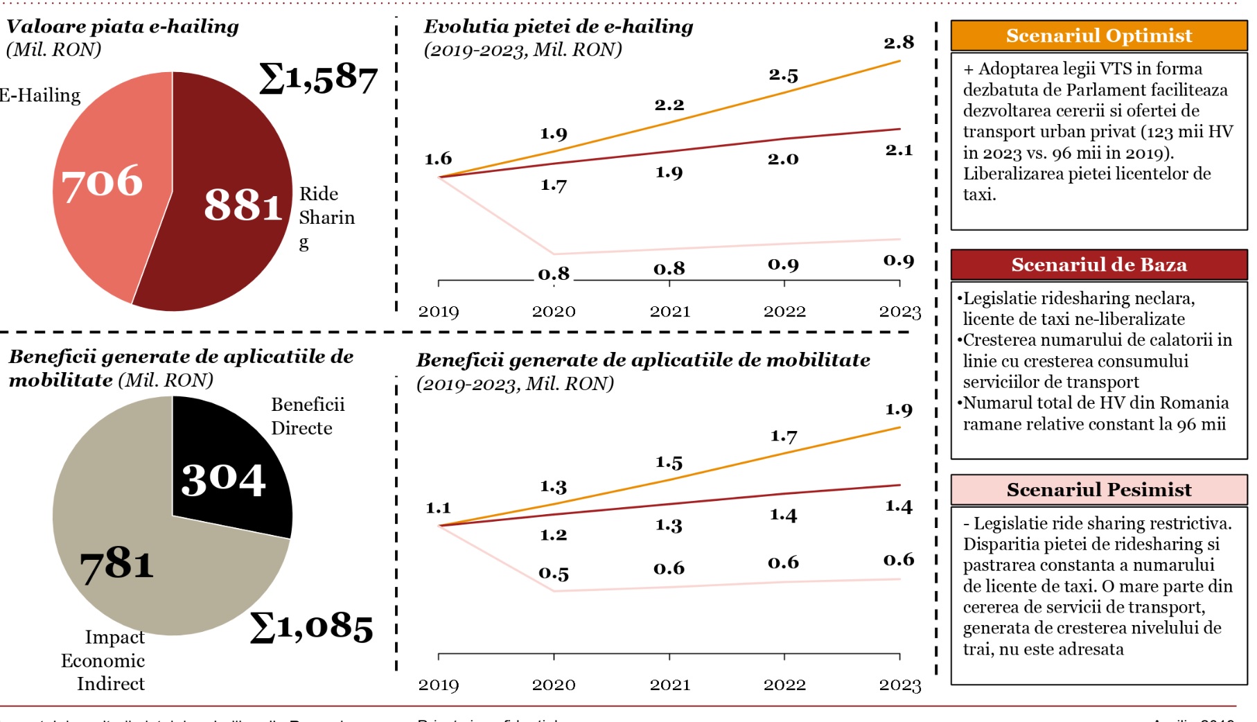 Piața locală a platformelor de mobilitate urbană (de tip Uber sau Clever) este estimată la 1.587 milioane de lei, din care piața de e-hailing (care include contravaloarea serviciilor de taximetrie generate prin aplicațiile de mobilitate urbană) este de 706 milioane de lei, iar cea de ride-sharing de 881 milioane de lei.