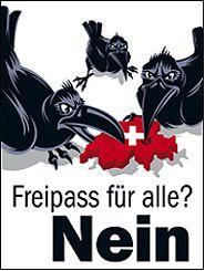 Afisul partidului de guvernamant UDC, care poate fi vazut in toate locurile publice din Elvetia dar si pe pagina de promovare a campaniei prezinta trei corbi supradimensionati care se infrupta din teritoriul elvetian. Presedintele partidului, Toni Brunner a explicat intr-o conferinta de presa: „Corbii sunt lacomi, sunt niste pasari agresive si hoate, care ameninta existenta altor pasari. Ei sunt adesea asociati, in mitologie, cu vrajitoarele”.