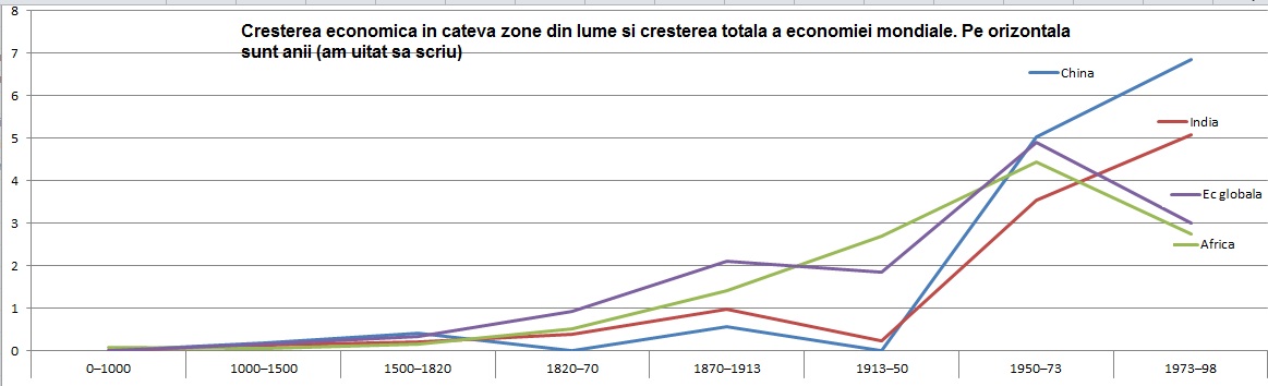 Mai intai niste date generale, ca sa avem de unde porni discutia: Pe parcursul ultimilor 2000 de anisori, populaţia lumii a crescut de 22 de ori, venitul pe cap de locuitor a crescut de 13 ori, iar PIB-ul mondial de aproape 300 de ori. O spune Maddison.Daca ne uitam doar la mileniul trecut, numarul locuitorilor a crescut cu o sesime, iar venitul per capita mai degraba a stagnat. Din 1820 incoace acelasi venit/capita a crescut mai mult de opt ori,iar populaţia de cinci ori. Creşterea economică mondială a încetinit în mod substanţial din 1973, iar avansul din Asia a fost compensat de stagnarea sau regresul în altă parte, scrie Dan Popa pe blogul Hymerion.ro.