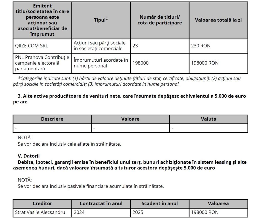 Liberalul menționează că s-a împrumutat cu 198.000 de lei de la Vasile Alecsandru Strat, sumă care era scadentă în 2025.