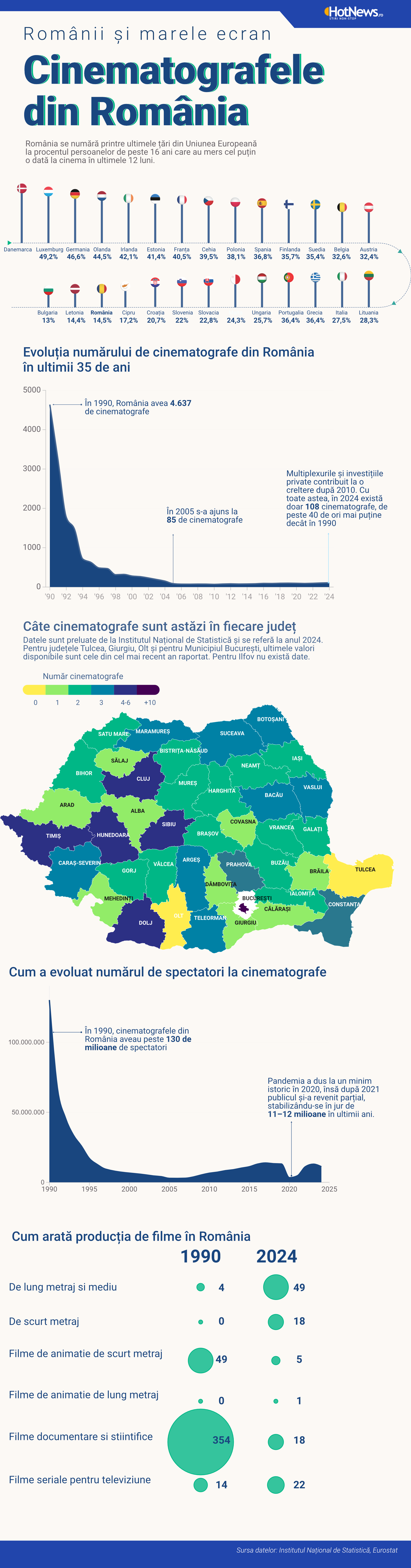 România avea, în 2024, 108 cinematografe, care au găzduit peste 11 milioane de spectatori. Numărul este unul substanțial mai mic față de „aparenta perioadă de glorie”, așa cum o numește regizorul Tudor Giurgiu. În ‘90, în toată țara erau 4.637 de cinematografe și instalații cinematografice. De atunci, a urmat un declin, care apoi s-a suprapus „paradoxal peste un reviriment al cinematografiei locale”. Acest lucru nu s-a întâmplat doar în România, ci și în alte țări europene.