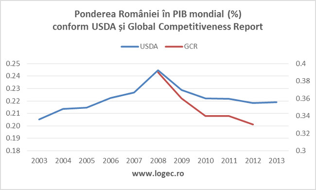 Haideti sa ne uitam la PIB un pic altfel, analizand locul Romaniei in lume. In graficul de mai jos am aratat cum a evoluat ponderea Romaniei in PIB mondial, atat conform datelor publicate de US Department of Agriculture cat si in Global Competitiveness Report. Chiar daca cifrele sunt diferite, trendul este acelasi: in ultimii ani Romania a cazut multe trepte pe scara puterii economice a natiunilor lumii. Conform GCR, in anul 2008 Romania era a 39-a economie a lumii, cu o pondere in PIB mondial de 0,39%, depasind Cehia (0,38%). De atunci incoace am continuat sa scadem: anul trecut am ocupat locul 47, cu o pondere in PIB global de 0,33%, fiind depasiti de Cehia (0,35%) care a scazut si ea dar mai lent decat noi.